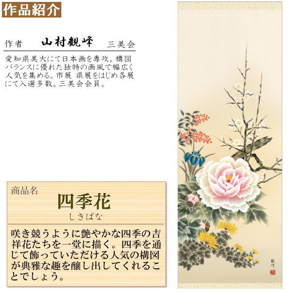 掛け軸 花鳥画 年中掛け 山村観峰 四季花 洛彩緞子本表装 尺5 桐箱入り 1個 日本製 送料無料 名画複製 掛軸 年中飾り 春夏秋冬 和風 高級感 インテリア 素敵 花 綺麗 季節飾り cv 来客用 和室 床の間 飾り 新築祝い お祝い 贈り物 ギフト プレゼント【あす楽対応】