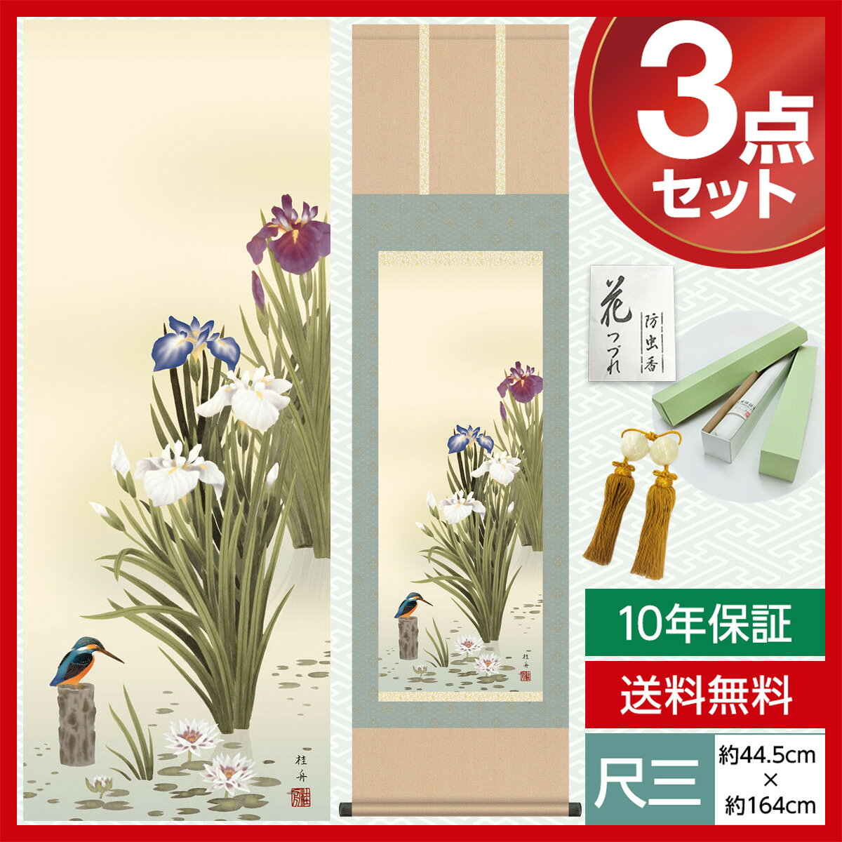 掛け軸 モダン 尺三 花鳥掛軸 四季花鳥 四季薫風 夏 菖蒲 長江 桂舟 三美会 掛軸幅:44.5cm×高さ:約164cm 洛彩緞子本表装 表装品質10年間保証 掛け軸 モダン 収納箱 防虫香 風鎮 付き モダン