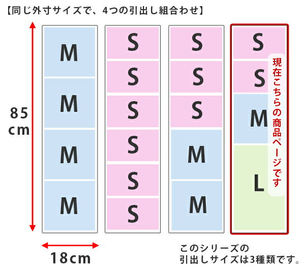 入れたいものに合わせて同じシリーズで組み合わせこのシリーズのストッカー引出しにはS・M・Lの3サイズあり、ストッカーはそれぞれの引出しの組み合わせで4種類。