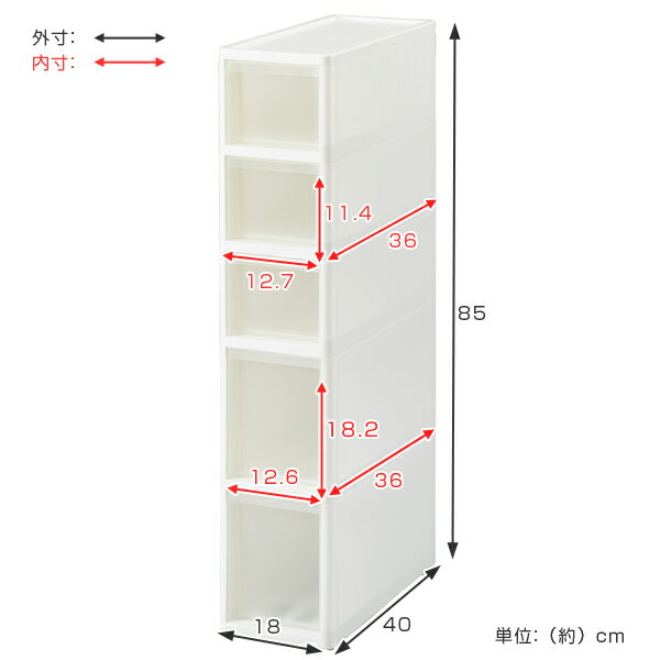 サイズ外寸:約 幅18×奥行40×高さ85(cm)引出し内寸:S約 幅12.7×奥行36×高さ11.4(cm)M約 幅12.6×奥行36×高さ18.2(cm)内容量1個材質天板、枠、引き出し、コロ:ポリプロピレン生産国日本製備考耐荷重:天板1kgSサイズ引出し1段当たり2kgMサイズ引出し1段当たり3kg※高さが80cmや90cmのシステムキッチンでは高さが揃いませんので、ご注意ください。