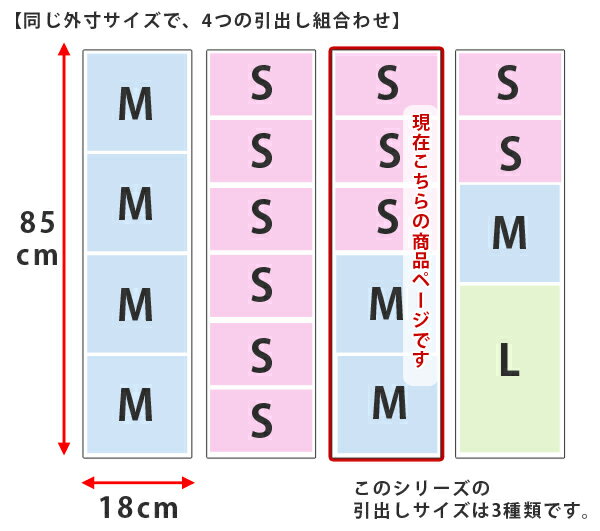 入れたいものに合わせて同じシリーズで組み合わせこのシリーズのストッカー引出しにはS・M・Lの3サイズあり、ストッカーはそれぞれの引出しの組み合わせで4種類。